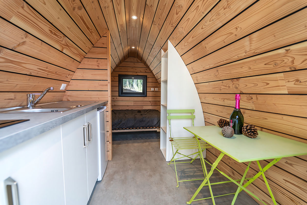 Cette pigne d'une surface de 11m2 version 2 chambres propose un aménagement standard et confortable pour 4 personnes. Parfaitement intégrée dans le paysage, elle est idéale dans un camping pour recevoir les voyageurs ou accueillir votre famille dans un espace cosy et indépendant. Laissez ensuite libre court à votre imagination pour une pigne à votre image.